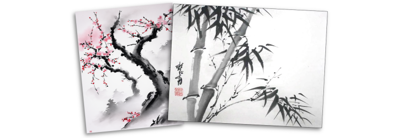Typical Sumi-e motifs include elements of nature such as bamboo, cherry blossoms, orchids, and landscapes. These are chosen not only for their aesthetic beauty but also for their cultural and spiritual symbolism. For instance, bamboo represents durability and flexibility, while cherry blossoms symbolize the transience of existence.