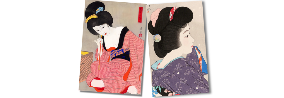 During the Meiji period (1868-1912) and beyond, Bijin-ga began to change. Western influence increased, and the depictions adapted to new aesthetic and cultural norms. Artists like Kiyokata Kaburagi and Jun'ichi Nakahara integrated Western techniques and themes into their works, creating a new form of Bijin-ga that combined traditional and modern elements. This period marked a transition in Japanese society, where traditional values and modern influences collided. Bijin-ga artists of this period began to depict women in Western-inspired clothing and with modern hairstyles, reflecting changing beauty ideals and the increasing integration of Western culture in Japan.